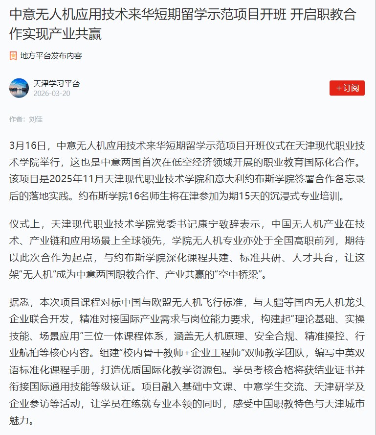 3月16日,中意無人機應用技術來華短期留學示范項目開班儀式在天津現代職業技術…